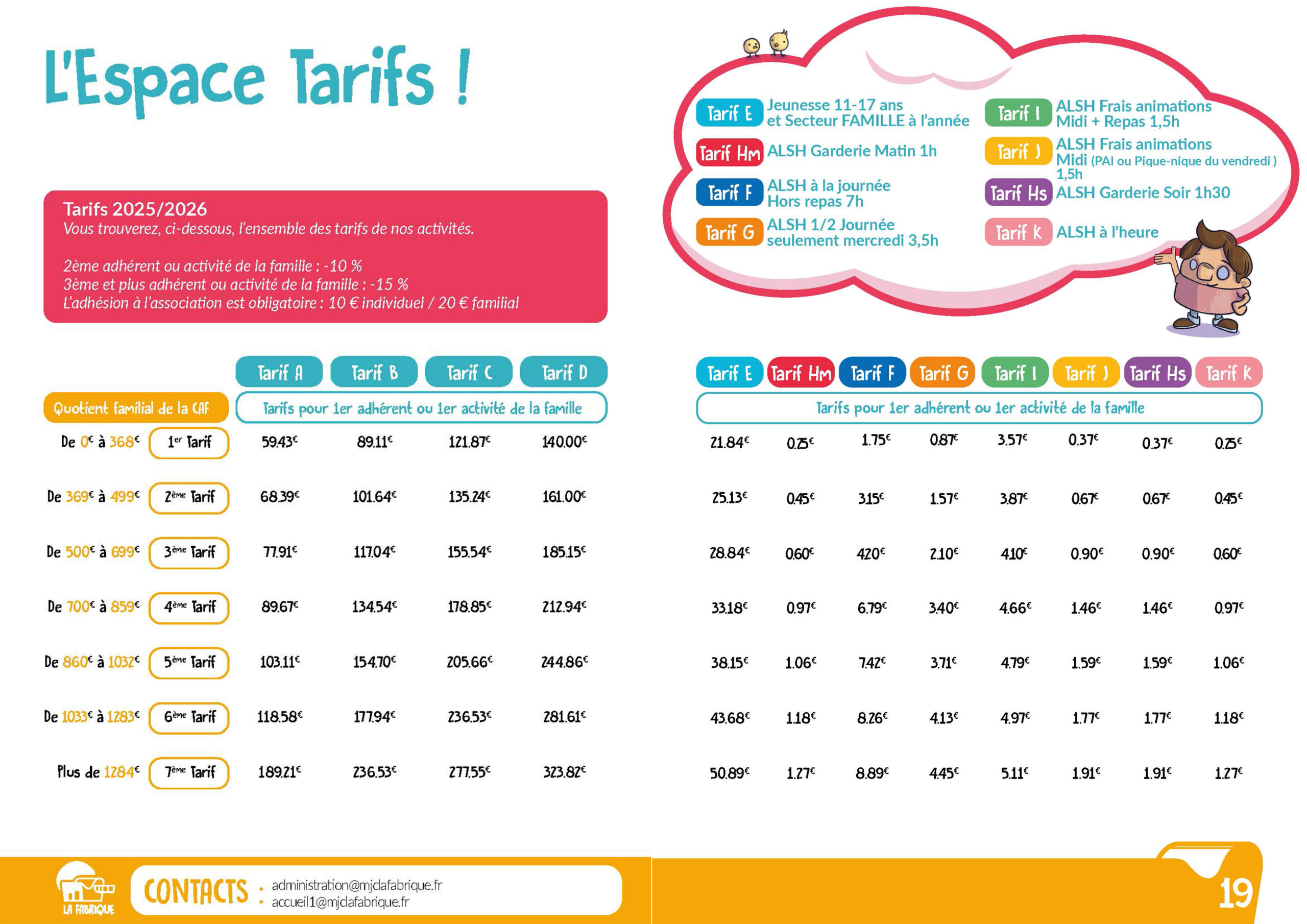 Vous trouverez, ci-dessous, l’ensemble des tarifs de nos activités.